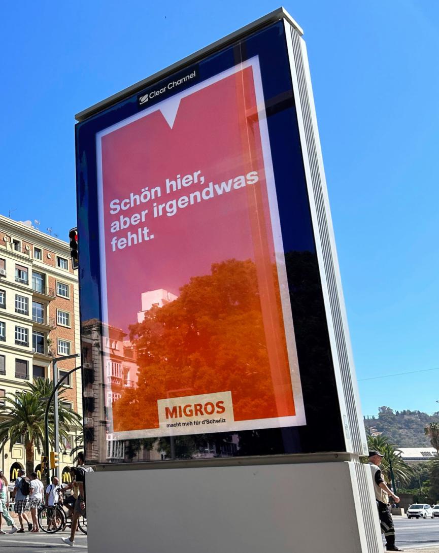 Le moment Migros Si vous avez passé des vacances en Italie ou en Espagne cet été, vous avez peutêtre été surpris d’y voir un petit clin d’œil de Migros. Par exemple, ici sur la Plaza de la Marina à Málaga, en Espagne, une affiche en allemand plaisante: «C’est joli ici, mais il manque quelque chose.» Des affiches ont été placardées dans sept lieux en Espagne et en Italie.