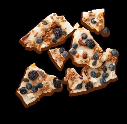 800 g Joghurt auf ein mit Backpapier belegtes Blech streichen. 150 g Konfitüre darauf verteilen und mit einem Löffelstiel leicht marmorieren. 100 g Beeren auf dem Joghurt verteilen. Mit 100 g Granola bestreuen und leicht andrücken. Mindestens 3 Stunden im Tiefkühler fest werden lassen. Anschliessend aus dem Blech lösen und nach Belieben in Stücke brechen. Sofort servieren.