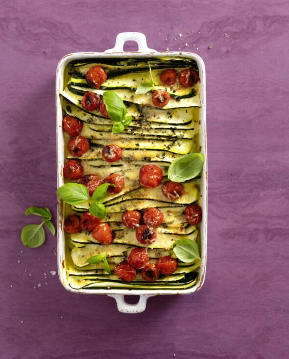 Préchauffer le four à 220 °C, chaleur de voûte et de sole. À l’aide d’une mandoline, détailler 700 g de courgettes en longues bandes d’env. 2 mm d’épaisseur. Couper 300 g de mozzarella d’abord en deux, puis en tranches. Hacher un demi-bouquet de basilic, le mélanger avec 200 g de tomates cerises, saler et poivrer. Badigeonner un plat à gratin d’huile d’olive et y dresser les courgettes en alternance avec la mozzarella. Ajouter les tomates, arroser d’un filet d’huile d’olive et parsemer de parmesan râpé (30 g). Cuire env. 30 min au milieu du four. Plus de recettes avec des courgettes sur migusto.ch