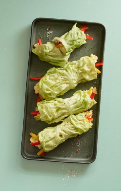 An 16 Salatblättern die Mittelrippen flach schneiden, damit sich die Blätter rollen lassen. Jeweils 2 Blätter leicht überlappend aufeinanderlegen, mit je 2 bis 3 EL Frischkäse bestreichen. 2 Peperoni in schmale Streifen schneiden. 8 Eier verquirlen, mit Salz und Pfeffer würzen. 2 EL Butter in einer Bratpfanne schmelzen, Ei dazugiessen, zu Rührei stocken lassen. Jeweils 2 bis 3 EL Rührei auf die Blätter geben. Einige Peperonistreifen dazulegen und alles vorsichtig satt aufrollen. Mehr Rühreirezepte auf migusto.ch