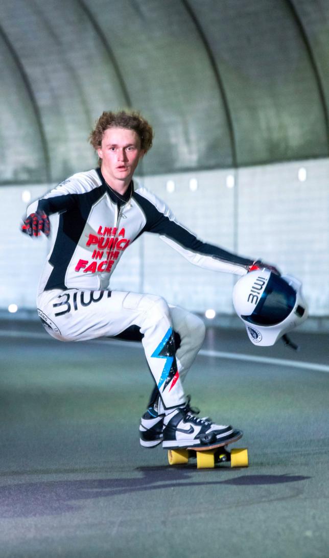 124,8 km/h, record personnel. Quand Grégoire Schwab monte sur son skate, ce n’est pas pour enchaîner les figures ou aller à la piscine. C’est pour rouler vite, très vite. Une attirance pour le démon de la vitesse qu’il a développée très tôt. «À 10 ans, j’ai trouvé la vieille planche de mon père dans la cave de ma grand-mère. J’ai directement cherché une pente pour essayer d’aller le plus vite possible, se rappelle le jeune homme originaire de Marsens (FR). J’ai plongé dedans sans trop réfléchir.»