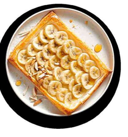 Préchauffer le four à 220 °C, chaleur de voûte et de sole. Dérouler une abaisse rectangulaire de pâte feuilletée de 320 g, la partager en quatre et déposer les rectangles de pâte sur une plaque chemisée de papier sulfurisé. Délimiter les bords: pratiquer une légère entaille à env. 1 cm du bord le long des côtés, mais sans inciser de part en part. Couper 6 bananes en rondelles et les répartir sur les pâtes. Hacher 40 g d’amandes et en parsemer les fruits. Battre 1 œuf et en badigeonner les bords. Cuire env. 10 min au milieu du four. Arroser de 4 cc de miel de nectar liquide et servir. www.migmag.ch/tarte-banane