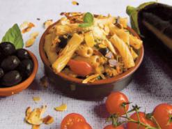 Zubereitung der kleinen Mahlzeit für vier Personen: Backofen auf 220 °C Umluft vorheizen. 2 Feta à 250 g auf ein mit Backpapier belegtes Blech legen. Mit wenig Olivenöl beträufeln und mit Pfeffer würzen. In der Ofenmitte ca. 15 Minuten backen. 400 g Cherrytomaten, 80 g grüne Oliven und 4 Scheiben Brot mit Olivenöl beträufeln. Mit Salz und Pfeffer würzen. Nach rund 10 Minuten der Backzeit beigeben und alles fertig backen. Rezept auf migusto.ch