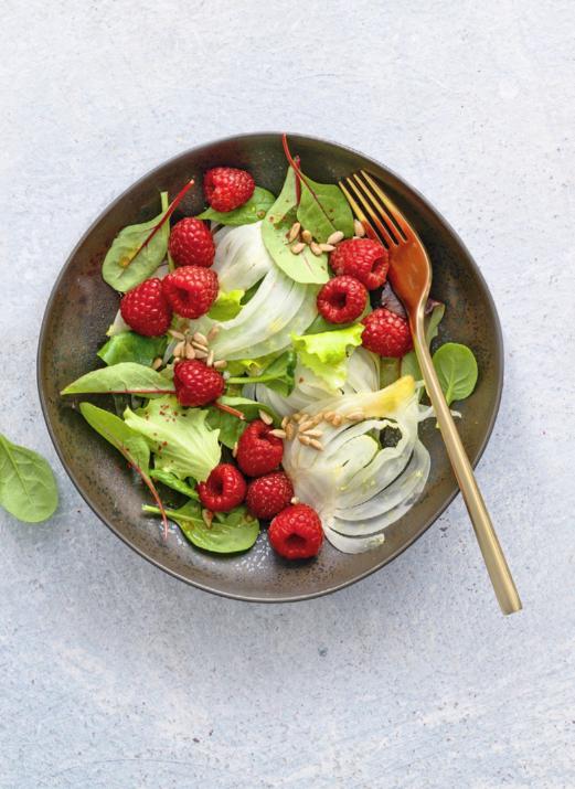 20 g Sonnenblumenkerne in einer Pfanne leicht rösten. Salzen. 100 g Fenchel fein hobeln. 3 EL Olivenöl und 2 EL Rotweinessig verrühren. Mit Salz und Pfeffer abschmecken. 80 g gemischten Blattsalat, Fenchel, 120 g Himbeeren und Sonnenblumenkerne anrichten. Mit Dressing beträufeln. Mehr Salatrezepte auf migusto.ch