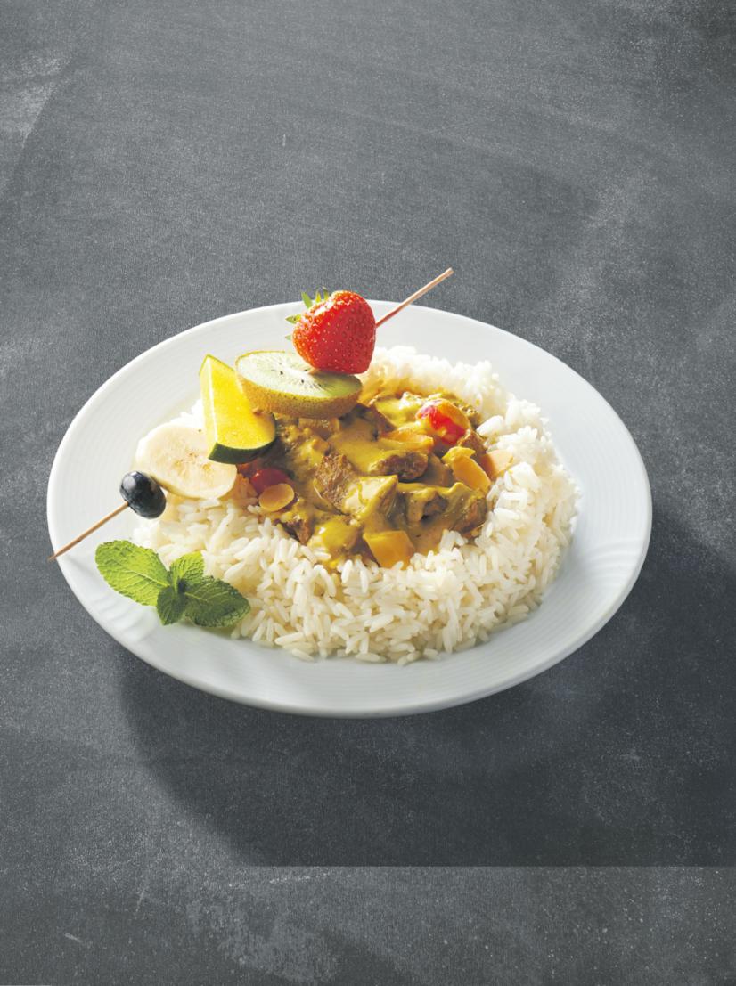 Kalbsgeschnetzeltes Casimir mit Reis und Früchtegarnitur