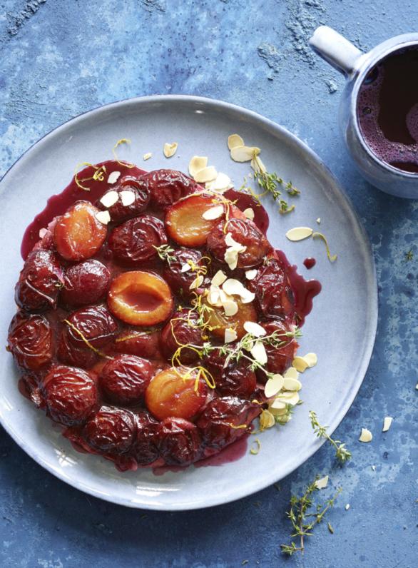 Préchauffer le four à 220 °C. Couper les pruneaux en deux, les dénoyauter puis les partager une nouvelle fois en deux. Couper l’oignon en deux puis en fines tranches. Épépiner le piment et le hacher menu. Effeuiller le thym. Mélanger le tout avec le sucre, le vinaigre, l’huile et le sel.