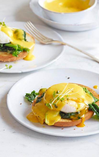 160 g Spinat erhitzen, mit Salz und Pfeffer würzen. 2,5 dl Sauce hollandaise unter Rühren erhitzen, ⅓ der Sauce zum Spinat rühren. Inzwischen in einer Pfanne reichlich Wasser mit 3 EL Essig aufkochen, Hitze reduzieren. 4 Eier einzeln in Tassen aufschlagen, nacheinander vorsichtig ins Wasser gleiten lassen. Eier 3–4 Minuten pochieren, aus dem Wasser heben. Spinat auf 4 Brotscheiben verteilen, Ei darauflegen und mit der Sauce begiessen. Mit Salz und Pfeffer würzen, sofort servieren. Mehr Rezepte mit Eiern auf migusto.ch