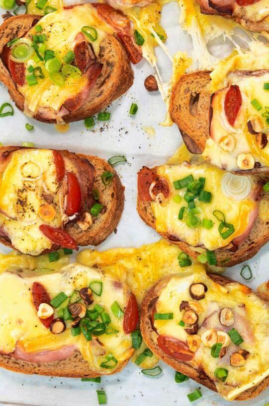 Backofen auf 210 °C Unter-/Oberhitze vorheizen. 4 Kürbiskerngipfel aufschneiden. Untere Hälfte mit 4 TL weicher Butter, Deckel mit 2 TL Senf bestreichen. 80 g Hinterschinkentranchen dritteln. ⅓ von 250 g Gruyère grob raffeln, Rest in dünne Scheiben schneiden. Gipfeliunterhälften auf ein mit Backpapier belegtes Blech legen. Mit Schinken- und Käsescheiben belegen. Deckel aufsetzen, mit geriebenem Käse und Pfeffer bestreuen. In der Ofenmitte ca. 10 Minuten überbacken und sofort servieren. Mehr Gipfelirezepte auf migusto.ch