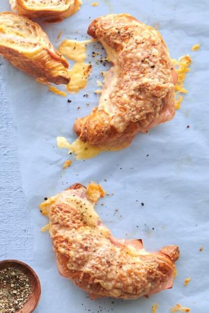 Préchauffer le four à 210 °C, chaleur de voûte et de sole. Couper 4 croissants aux graines de courge en deux. Tartiner les fonds avec 4 cc de beurre mou et les chapeaux avec 2 cc de moutarde. Partager les tranches de 80 g de jambon de derrière en trois. Râper un tiers de 250 g de gruyère, trancher finement le reste. Espacer les fonds de croissant sur une plaque chemisée de papier sulfurisé, les garnir de jambon et de tranches de fromage. Poser les chapeaux, puis les parsemer de fromage râpé et de poivre. Glisser au milieu du four et faire gratiner env. 10 min. Servir aussitôt.
