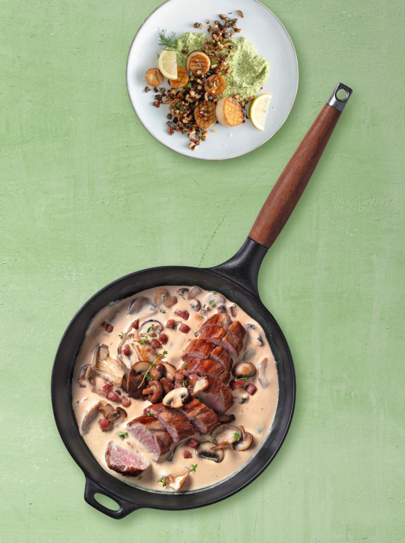 Kleine Kürbisse kann man ganz, grössere halbiert in den Backofen geben – noch mit der Schale. Nach 30 Minuten Garzeit bei 120 Grad löst sich das Fruchtfleisch ganz leicht. Beim Orangenen Knirps oder Hokkaido-Kürbis spart man sich das Schälen komplett, denn anders als bei anderen Sorten gart seine Schale ebenso schnell wie das Fruchtfleisch.
