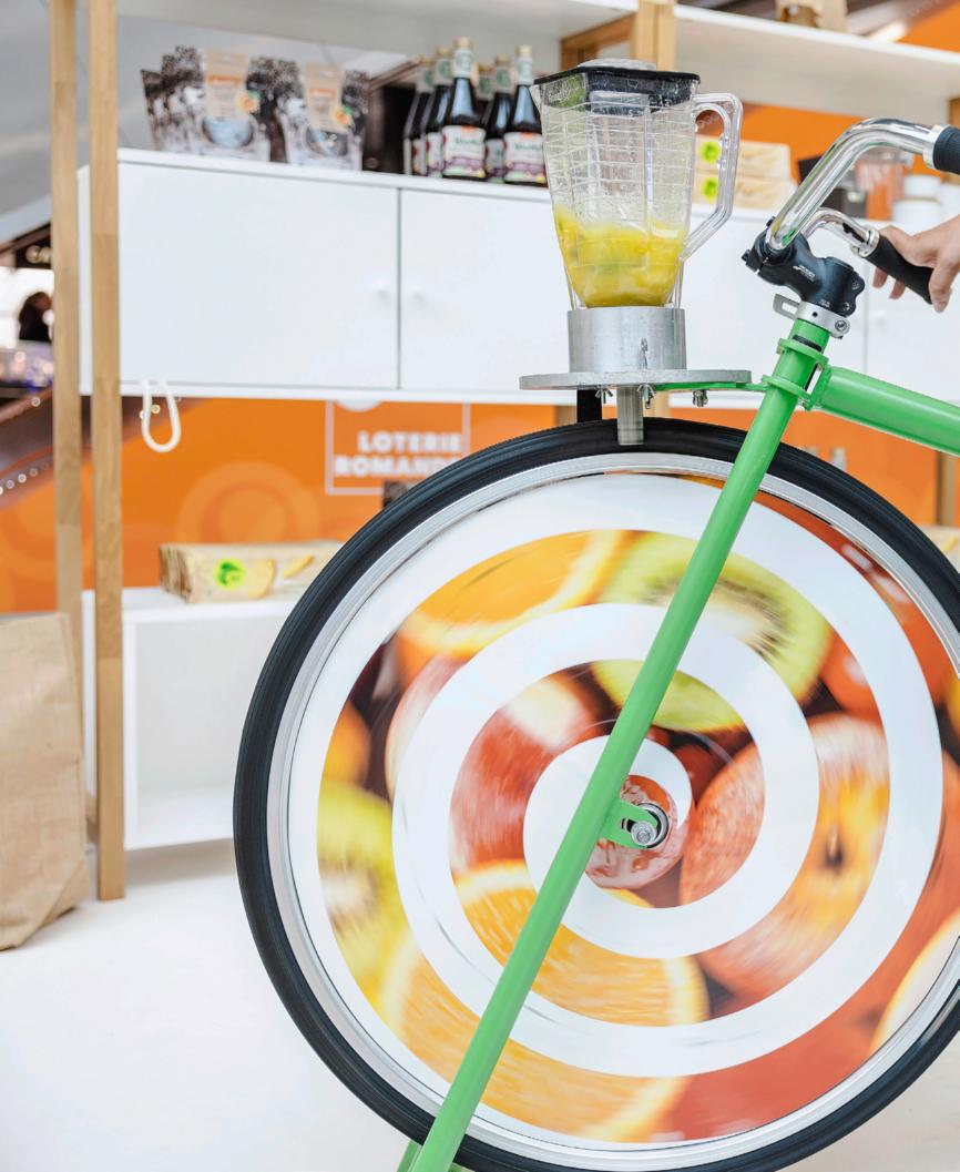 Le moment Migros Dans le cadre d’une animation sur le thème du bio, un vélo équipé d’un blender a été installé dans le magasin Migros de Romanel-surLausanne (VD). Les clients pouvaient ainsi jusqu’au 17 sep tembre créer leur propre smoothie bio en pédalant.
