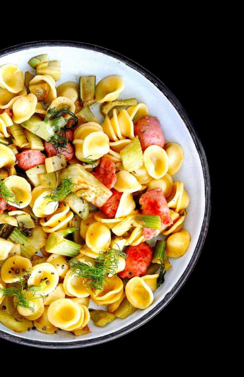 ORECCHIETTE MIT FENCHEL 300 g Orecchiette in reichlich Salzwasser al dente kochen. Abgiessen und abtropfen lassen. Inzwischen das Grün von 600 g Fenchel wegschneiden und beiseitestellen. Fenchel je nach Grösse längs vierteln oder sechsteln, quer in Streifen schneiden. In einer Bratpfanne mit 4 EL Olivenöl braten. Wurstbrät von 2 Tessiner Salsicce in Stücken aus der Haut in die Pfanne drücken. Ca. 5 Minuten braten. Etwas von der Schale einer halben Zitrone dazureiben, diese auspressen und den Saft dazugeben. Fenchel dazugeben und bissfest dünsten. Alles mit Orecchiette mischen und mit Salz und Pfeffer abschmecken. Mit Fenchelgrün servieren. Rezept auf migusto.ch