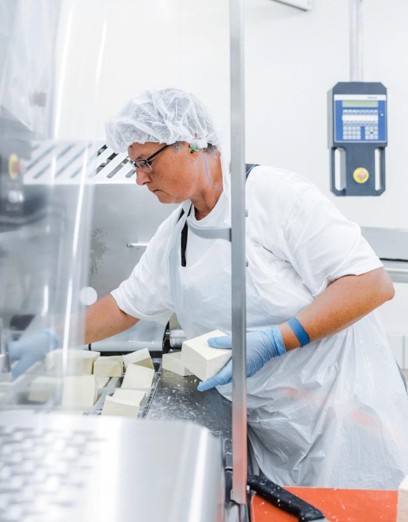 Le moment Migros À Estavayer-le-Lac (FR), Elsa-Mifroma ne produit pas que du lait et des yogourts. L’entreprise, qui fait partie de Migros Industrie, élabore aussi du tofu bio. Il est ici découpé en blocs de 250 g, qui seront ensuite conditionnés et stérilisés.