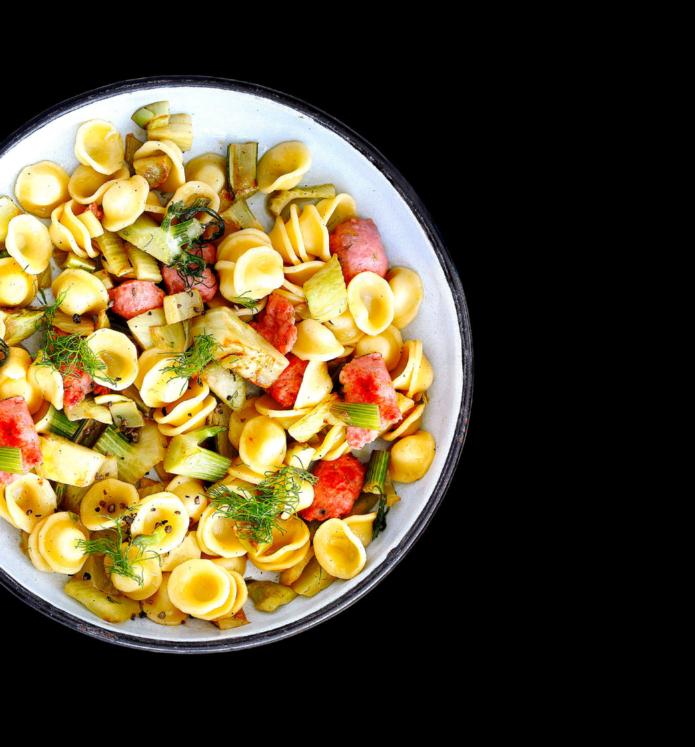 Cuire 300 g d’orecchiette al dente dans de l’eau bouillante salée. Entre-temps, retirer les pluches de 600 g de fenouil et les réserver. Couper le fenouil en lanières. Faire revenir dans une poêle avec de l’huile. Extraire la chair de deux saucisses à rôtir de porc d’env. 180 g et poêler env. 5 min. Y râper un peu de zeste de citron. Exprimer le jus du citron et l’ajouter. Ajouter le fenouil et l’étuver en le gardant croquant. Mélanger le tout avec les orecchiette, puis relever de sel et de poivre. Servir avec les pluches. www.migmag.ch/orecchiette-au-fenouil