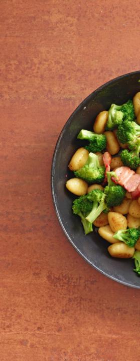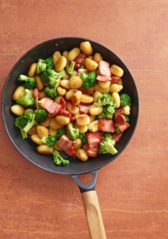 Partager 500 g de brocoli en bouquets. Les blanchir brièvement dans de l’eau salée, égoutter. Couper 300 g de lard fumé en tranches et les rissoler 2 min dans 1 cs d’huile. Ajouter 700 g de gnocchi et les faire dorer env. 4 min. Incorporer les brocolis, saler et poivrer. Plus de recettes avec des gnocchi sur migusto.ch