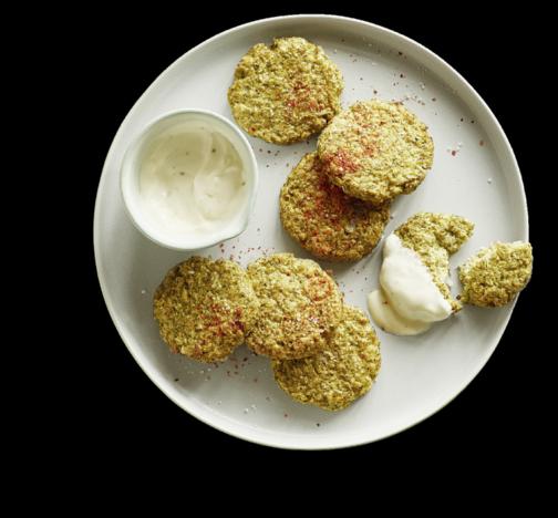 500 g Broccoli klein schneiden, Stiel schälen. Alles portionenweise im Cutter fein hacken. 60 g Hartkäse dazureiben. 2 Eier und 4 EL Mehl dazumischen. Mit Salz und Pfeffer würzen. Masse zu Plätzchen à ca. 60 men. Auf ein mit Backpapier belegtes Blech verteilen. In der Ofenmitte ca. 20 Minuten bei 200 °C Umluft (vorgeheizt) backen. 1 Becher griechisches Joghurt nature mit Salz und Pfeffer würzen. Broccoli-Plätzchen mit Joghurt servieren. Nach Belieben für etwas Schärfe mit Chilipulver würzen.