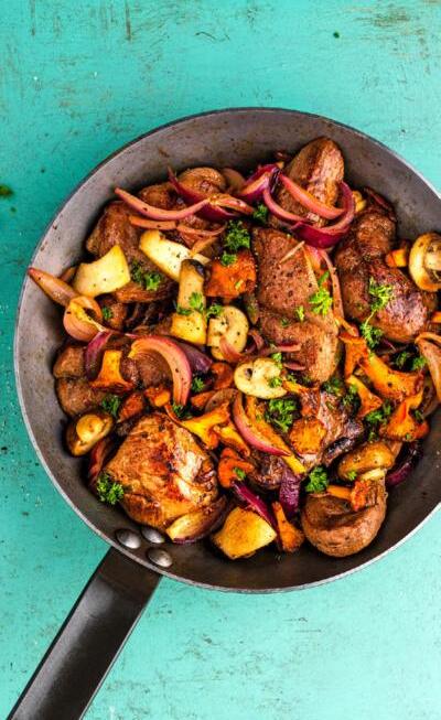 300 g gemischte Pilze putzen, klein schneiden. 2 Zwiebeln in Spalten schneiden. ½ Bund Petersilie hacken. 2 EL Olivenöl in Bratpfanne erhitzen, Pilze scharf anbraten. Zwiebeln dazugeben, Hitze reduzieren. Mit 3 EL Essig ablöschen, 2–3 Minuten dünsten. Salzen und pfeffern. Pilze aus der Pfanne heben, beiseitestellen. In derselben Bratpfanne 2 EL Öl erhitzen, 4 Rehschnitzel scharf anbraten, salzen und pfeffern. Pilze beigeben, kurz braten. Mit Petersilie bestreuen. Dazu passen Kartoffelstock oder Salzkartoffeln. Mehr Wildrezepte auf migusto.ch