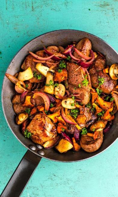 Nettoyer et débiter 300 g de champignons en petits morceaux. Couper 2 oignons en lamelles, hacher ½ bouquet de persil. Chauffer 2 cs d’huile d’olive dans une poêle et y saisir les champignons à feu vif. Ajouter les oignons, réduire le feu, mouiller avec 3 cs de condimento bianco et faire réduire 2-3 min. Retirer les champignons, réserver. Chauffer 2 cs d’huile d’olive dans la même poêle. Y saisir 4 escalopes à feu vif, assaisonner de sel et de poivre. Ajouter les champignons et poursuivre brièvement la cuisson. Parsemer de persil. Plus de recettes de gibier sur migusto.ch