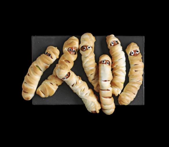 580 g ausgewallten Pizzateig längs in ca. 1,5 cm breite Streifen schneiden. Von einer Olive pro Mumie 2 Quadrate für die Pupillen schneiden. An einem Ende einen Teigstreifen um ein Wienerli wickeln. Dabei den Teig etwas lang ziehen und drehen. Unter dem «Turban» Platz für Augen lassen. Pro Wienerli ca. 6 Karottenstreifen um die Wurst wickeln, dabei jeweils sofort mit dem Teigstreifen fixieren, indem man ihn leicht schräg nach unten wickelt. Einen zweiten Teigstreifen von unten nach oben wickeln. Mumien mit Augenschlitz nach oben auf ein mit Backpapier belegtes Blech legen. In der Ofenmitte ca. 20 Minuten bei 200 °C (vorgeheizt) backen. Für die Augen mit Mayonnaise 2 Punkte und Olivenquadrate setzen.