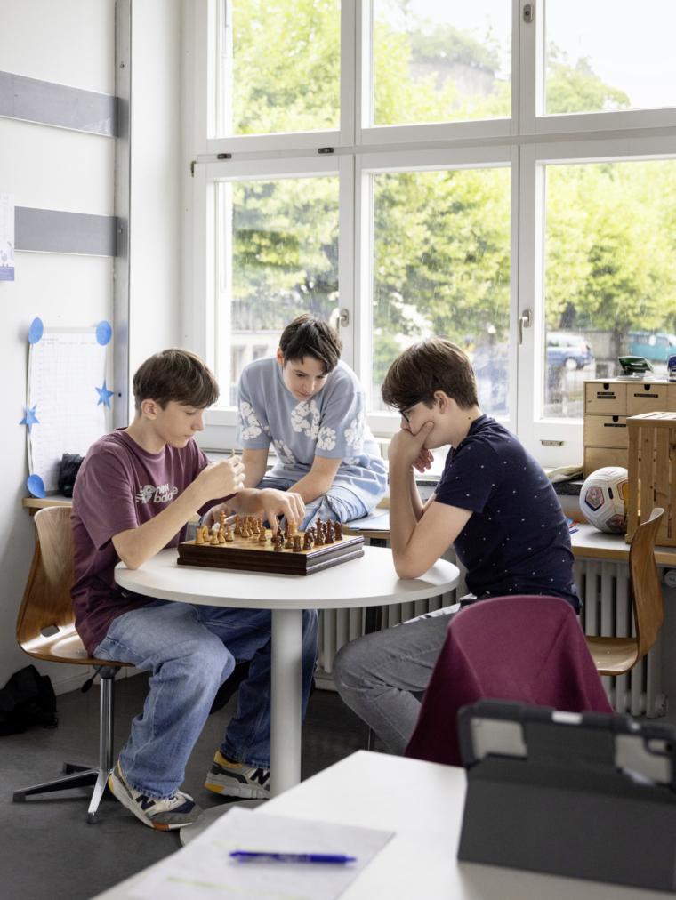 Niklas Prader, Elia Von Kaenel und Tom Saner (v. l.) spielen lieber Schach, als am Handy zu gamen.