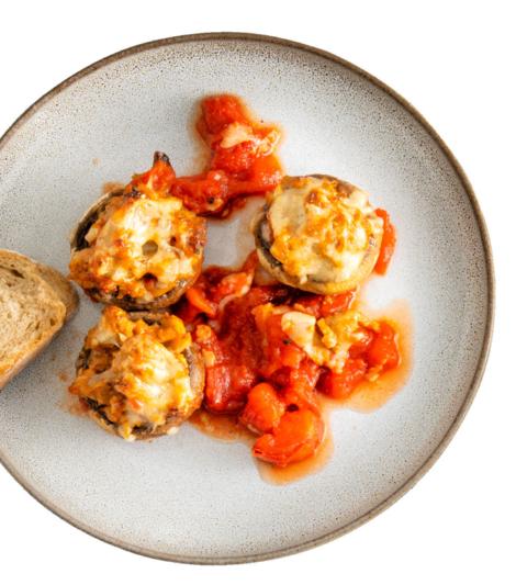 Retirer les pieds de 500 g de gros champignons de Paris, évider l’intérieur et hacher le tout. Extraire la chair de 2 saucisses à rôtir de porc, la défaire et la saisir dans 2 cs d’huile. Ajouter les champignons hachés, un tiers de 400 g de tomates concassées et la moitié de 150 g de fromage râpé et poursuivre la cuis son. Préchauffer le four à 200 °C. Répartir le reste des tomates dans un plat à gratin. Saler et poivrer. Farcir les chapeaux des champignons et les poser dans le plat. Parsemer du reste du fromage. Faire gratiner 20 min au milieu du four.