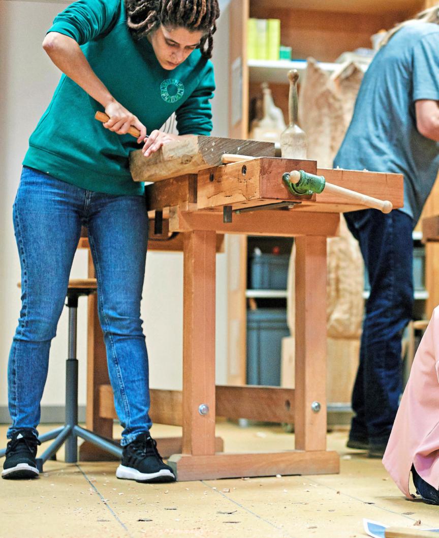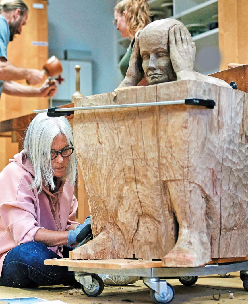 Le moment Migros L’une des participantes au cours «Sculpture sur bois» de l’École-club Migros de Lucerne travaille avec application sur une statue, qui peu à peu prend forme; la tête d’un homme pensif émerge déjà de l’énorme bloc de bois.