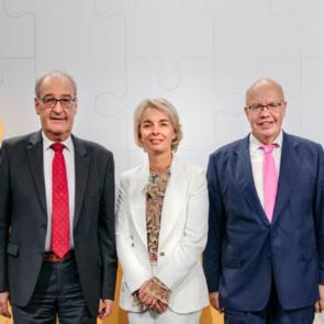 Ursula Nold, Präsidentin des Migros-GenossenschaftsBundes, hat am Genossenschaftskongress in Bern die Sorge für das Gemeinwesen als gesellschaftlichen Grundpfeiler gewürdigt. Mit Ursula Nold auf dem Podium: Bundesrat Guy Parmelin (links) und der ehemalige deutsche Bundesminister Peter Altmaier.
