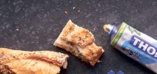 250 g Blätterteig auf wenig Mehl in der Grösse des Blechs auswallen. Mit einer Gabel mehrmals einstechen.