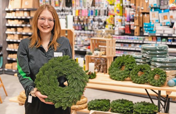 Bei Do it + Garden gibts alles an einem Ort: Michelle Bracher erklärt gern, wie man einen Adventskranz bastelt.«Steckt man Kränze nass, bleiben sie länger grün.»