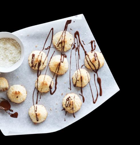 Monter 2 blancs d’œuf en neige avec ½ cc de sel. Ajouter 130 g de sucre et fouetter jusqu’à ce que la masse brille. Incorporer 150 g de noix de coco râpée. Préchauffer le four à 170 °C. Prélever des portions de la taille d’une noix, les façonner en boule et les déposer sur une plaque chemisée de papier sulfurisé. Glisser la plaque au four et cuire 13 15 min jusqu’à légère coloration. Les retirer et les laisser tiédir. Entre-temps, faire fondre 100 g de chocolat noir au bain-marie. Décorer les macarons de chocolat fondu et laisser durcir. La recette se trouve sur migusto.migros.ch