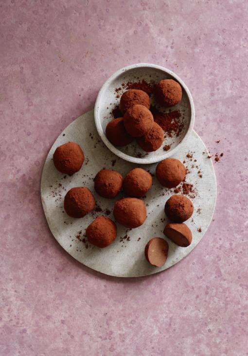 Rincer les pois chiches de 1 boîte de 400 g sous l’eau et les éponger avec du papier absorbant. Les réduire ensuite en purée fine dans un mixeur avec 60 g de purée d’amande. Hacher 100 g de chocolat végane, le faire fondre au bain-marie et l’incorporer aux pois chiches. Former des boules et les tourner dans env. 5 cs de cacao en poudre. Réserver au frais. Plus de recettes de petits chocolats sur migusto.ch