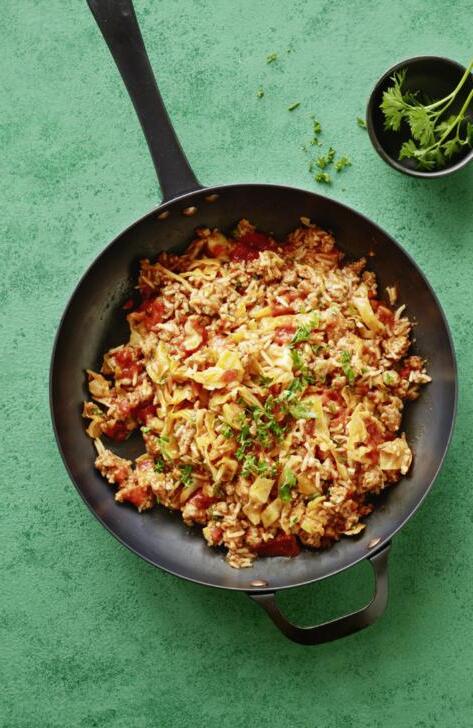 1 Weisskohl à 600 g halbieren, Strunk entfernen. Kohl klein schneiden. 4 Schweinsbratwürste aufschneiden, Wurstbrät herauslösen und zerkleinern. In 1 EL Öl in einer weiten Bratpfanne anbraten, Kohl beigeben und kurz mitbraten. 250 g gekochten Reis und ca. 800 g Tomatensauce dazugeben und ca. 10 Minuten rührbraten. Mit Salz und Pfeffer abschmecken. Mehr Weisskabisrezepte auf migusto.ch