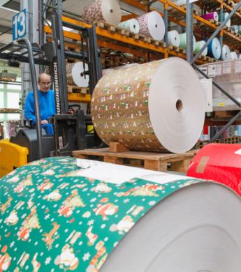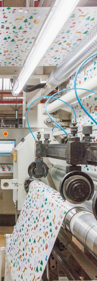le printemps et l’été 2024, des rouleaux de papier de 500 kilos, ressemblant à des meules de foin, attendent dans le hall voisin, alignés les uns à côté des autres. Ils alimentent la presse d’une bonne trentaine de mètres de long. Le monstre se met en marche, applique six couches d’encre en héliogravure et recrache à l’autre bout un papier noble, bleu foncé, parsemé de motifs de circonstance comme des rennes, des petits sapins et des visages barbus. Celui-ci sera ensuite découpé en rouleaux de taille commerciale, scellé et stocké, car il s’agit du premier lot de papier cadeau pour l’automne 2023.
