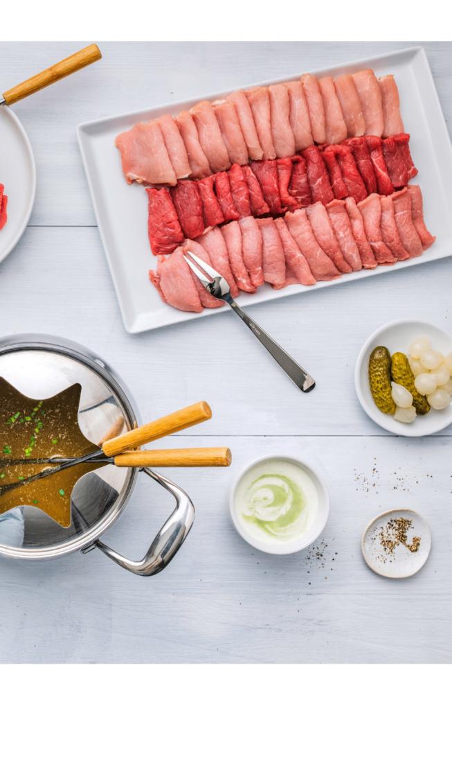 Commandez des plateaux de viande à fondue chinoise selon vos souhaits, en toute simplicité, sur theke.migros.ch/fr ou au comptoir boucherie.