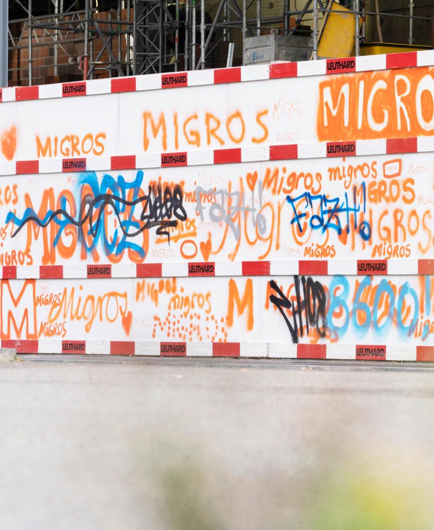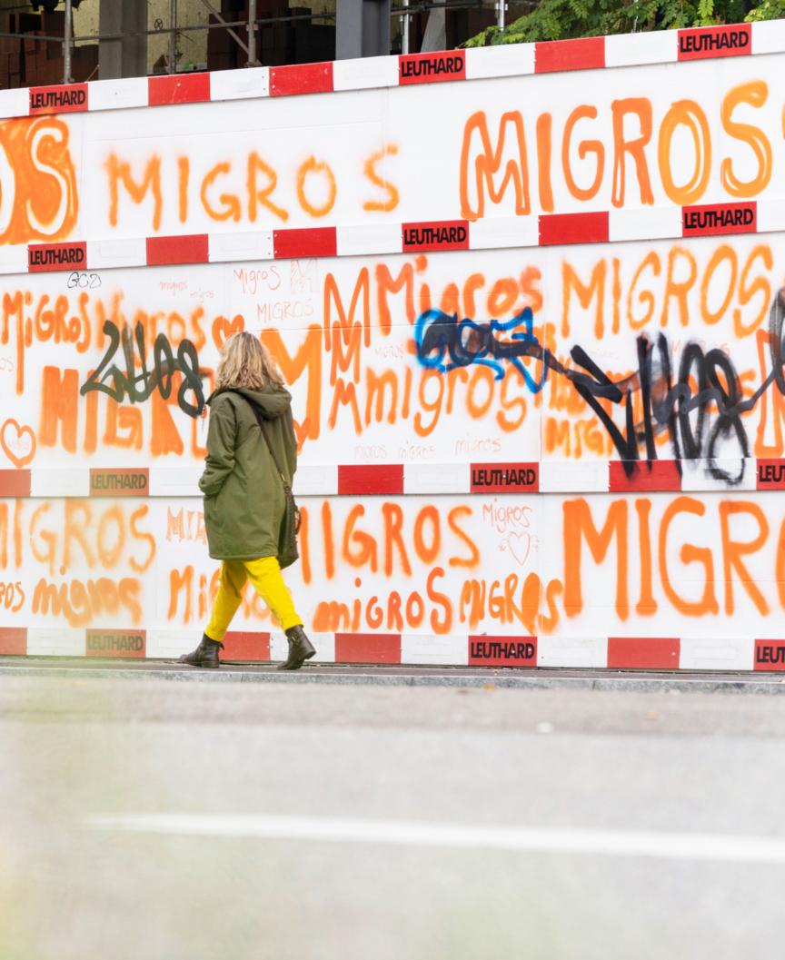 Migros-Moment in Zürich Der Hauptsitz der Migros Zürich wird umgebaut. Weisse Absperrplatten schirmen die Baustelle ab. Weiss blieben sie aber nicht lange: Inzwischen wurden sie mit dem orangen Migros-Schriftzug und anderen Graffitis vollgesprayt. Die Aufnahme ist am 5. Dezember entstanden.