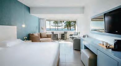 Logement Les suites Junior (65 m2) ont bain, douche, WC, sèche-cheveux, téléphone, TV, wifi gratuit, bouilloire, minibar, coffre-fort, climatisation, balcon ou terrasse vue parc. Situées en première rangée de plage, les suites Junior Beachfront (65 m2) ont en plus machine à expresso, balcon ou terrasse vue mer. Les suites Senior Beachfront (115 m2) ont salon séparé en sus, balcon ou terrasse avec coin repas