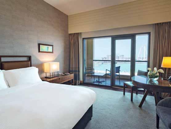 Unterkunft: Die Doppelzimmer Deluxe (45–57 m2) verfügen über Bad, Dusche, WC, Föhn; Sitzecke; Telefon, TV, WLAN (gratis), Nespresso-Kaffeemaschine, Tee-/Kaffeekocher, Minibar, Safe, Klimaanlage; Sicht auf die Marina oder aufs Meer. Auch mit Balkon und Meersicht buchbar. Die Executive Suiten (ca. 81 m2) sind geräumiger und bieten ein separates Wohnzimmer; Balkon mit Sicht auf den Arabischen Golf. Die 2-Schlafzimmer-Panorama-Suiten (ca. 129 m2) bieten 2 Schlafzimmer, ein separates Wohnzimmer mit Essbereich; Balkon mit Panoramasicht auf das Meer. Die Gäste dieser Zimmer profitieren von exklusiven Annehmlichkeiten.