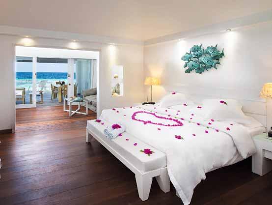 Unterkunft: Die Doppelzimmer Superior verfügen über Bad, Dusche, WC, Föhn, Bademäntel, Hausschuhe; Telefon, TV, WLAN (gratis), Gratissafe, Minibar, Tee-/Kaffeekocher, Klimaanlage; Balkon oder Terrasse zur Meerseite. Auch mit Pool- oder Meersicht oder direkt am Meer buchbar. Die Familienzimmer Deluxe bestehen aus 1 Schlafzimmer und 1 durch eine Schiebetür abgetrennten Wohn-/Schlafzimmer mit Bettsofa; Balkon oder Terrasse mit Pool-/Meersicht.