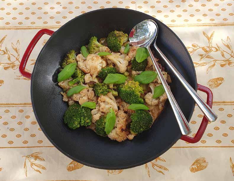 Pittige bloemkool uit de wok met broccoli in curry paste en kokosmelk