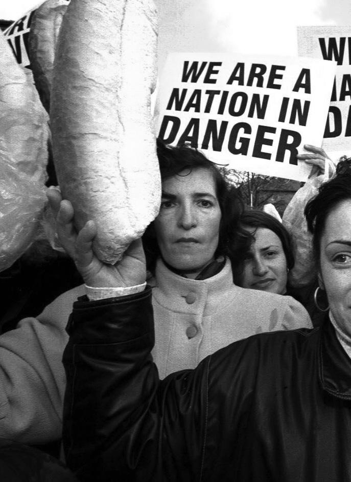 Fig. 20. March 1998: Kosovo-Albanian women hold loaves of bread as symbolic resistance against Serbian ethnic cleansing and genocide. Source: Unkown 31