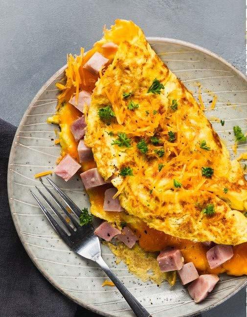 1. Agregar a un sartén con un poco de aceite en aerosol 2 huevos batidos sazonados con sal y pimienta ya que voltees el omelette enel sartén, rellenar con 2 rebanadas de jamón encubitos + 30 g de queso.
