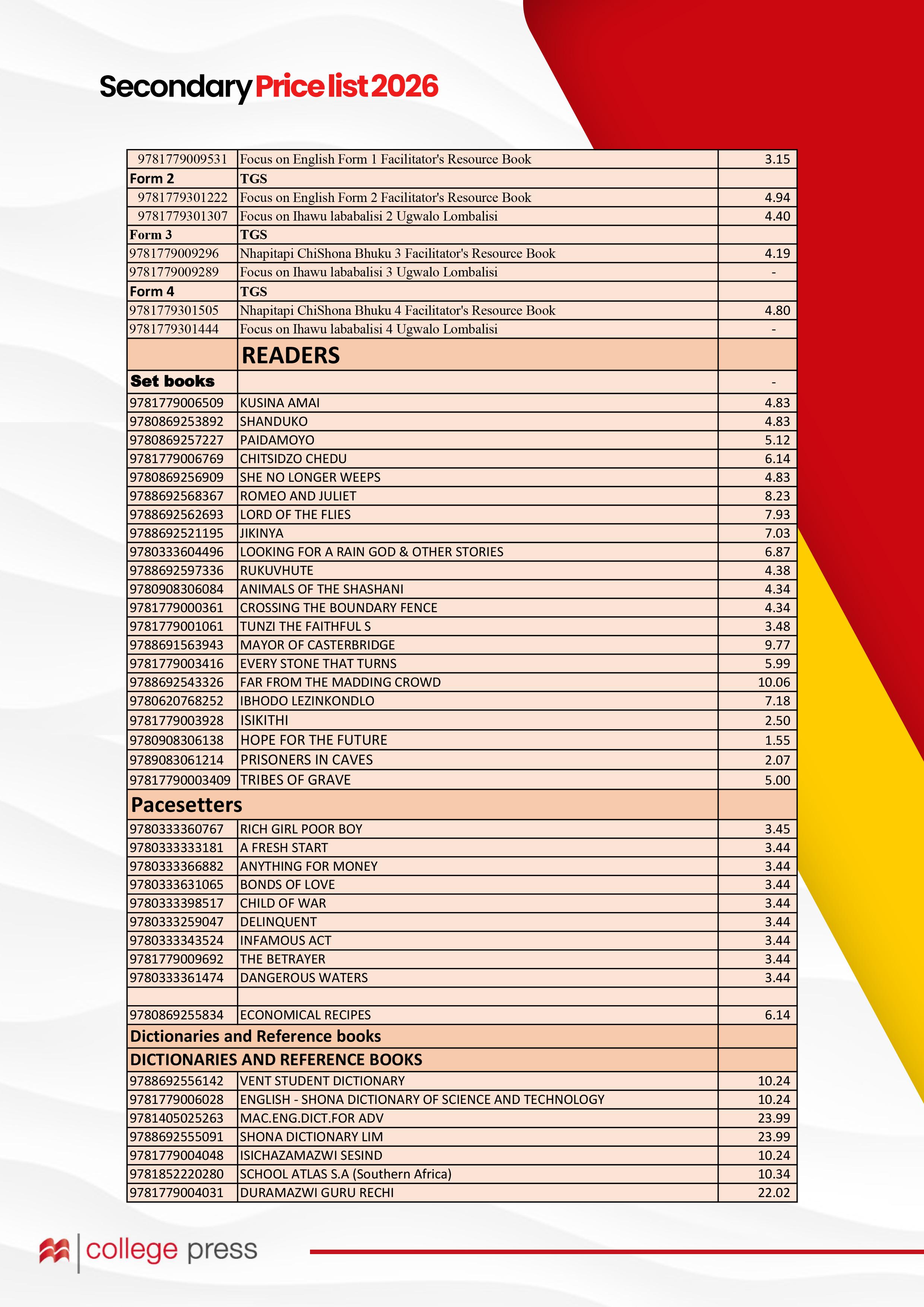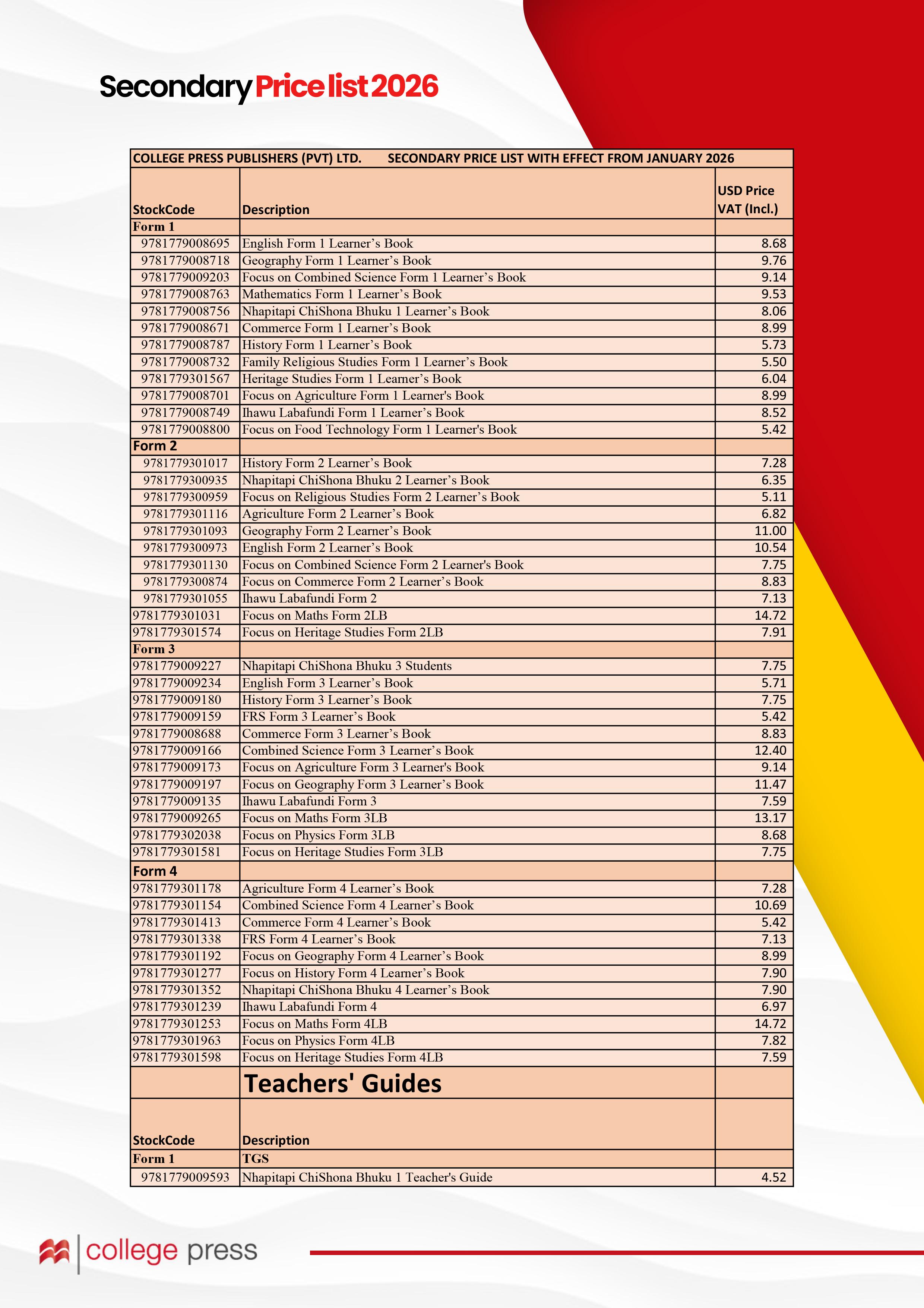 HBC Secondary Price List 2026