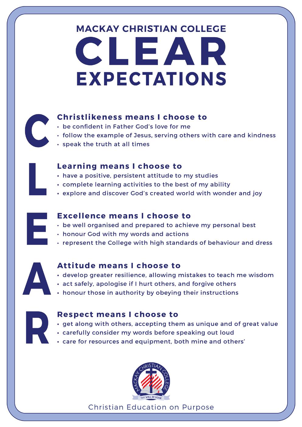 CLEAR is our values-based subject which supports our college values which are: Christlikeness, Learning, Excellence, Attitude and Respect. At Mackay Christian College we are passionate about helping students grow to become all the God wants them to be. The program has been developed with an embedded Christian world with a focus on fostering student’s academic, spiritual, character and emotional development.