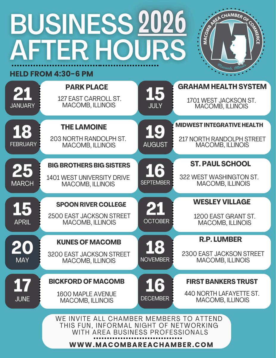 The next Business After Hours will take place on April 15 at Spoon River College It will be held from 4:30-6pm, and as always, is open to Chamber members as another benefit of membership Be sure to stop by as this one is sure to be well attended
