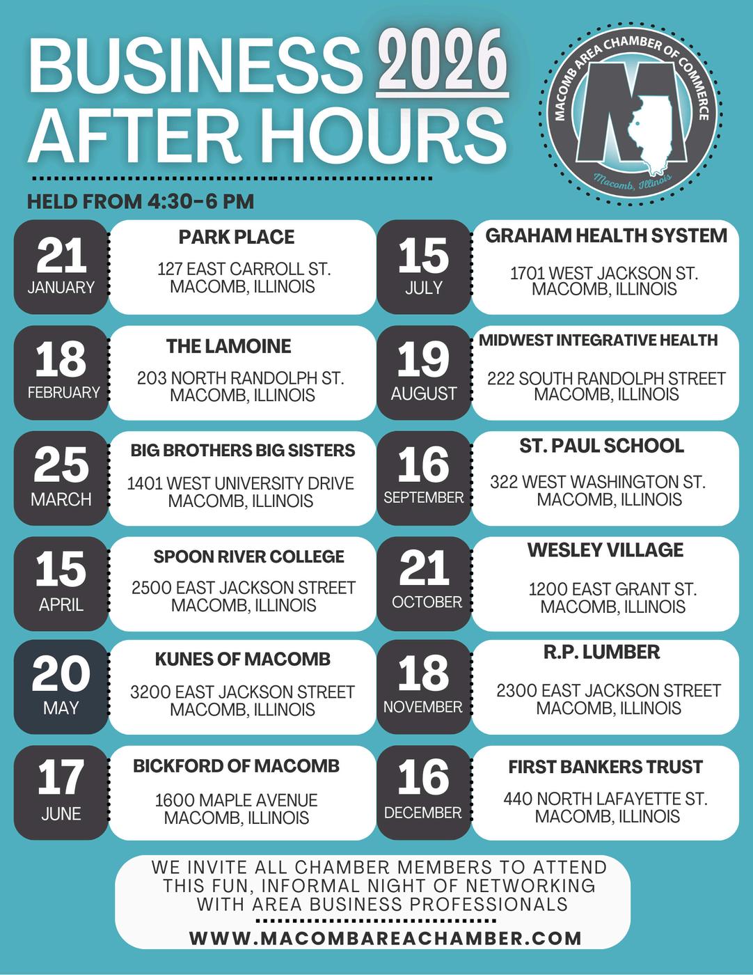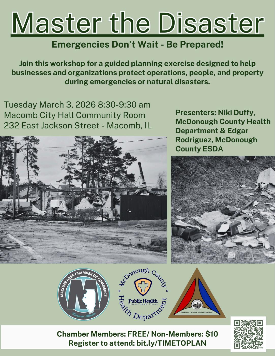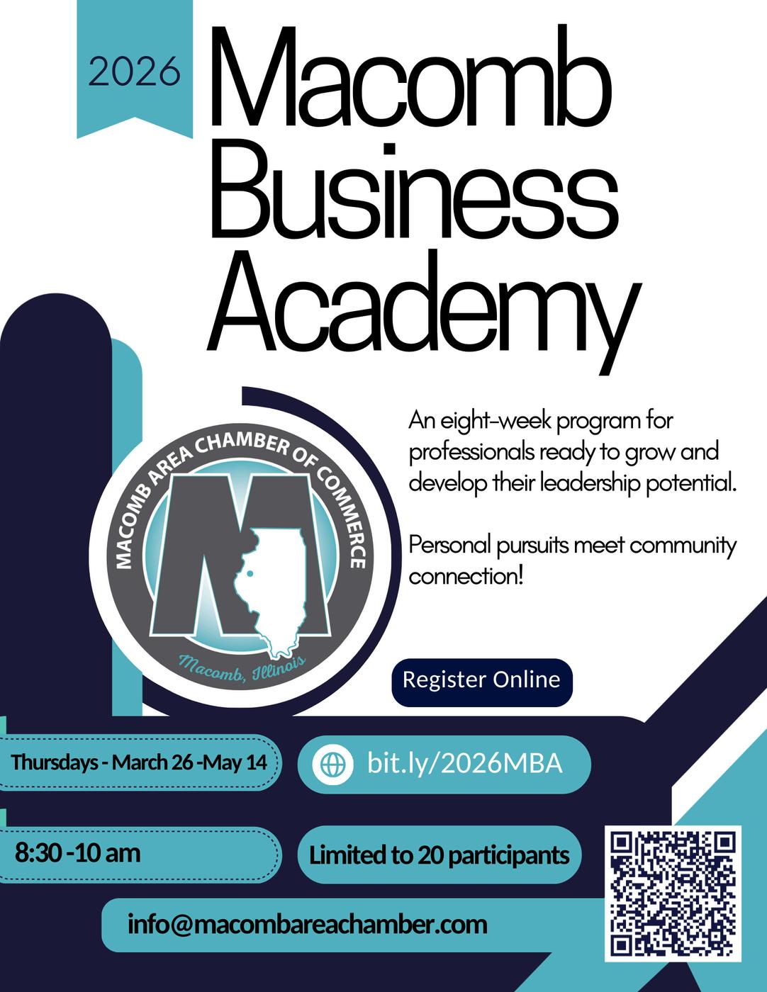 The next Business After Hours will occur on February 18 at The Lamoine. It will be held from 4:30-6pm, and as always, is open to Chamber members as another benefit of membership. Finally, don’t forget to register for the following events: Master the Disaster emergency planning workshop with the McDonough County Health Department on March 3 Macomb Business Academy which starts on March 26 and runs for eight weeks.