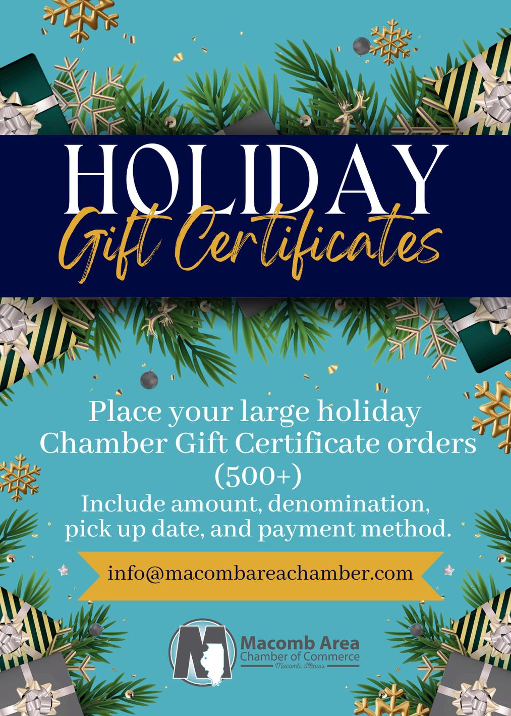 To ensure we keep you in the holiday spirit, we welcome you to call or email your order in ahead of time and I will get your gift certificates ready by your requested date with the payment of your choice. We do pass on a small processing fee to each customer for credit/debit card transactions, but our office gladly accepts cash/checks as well. If you are a Macomb Area Chamber member, we can even directly invoice your business!