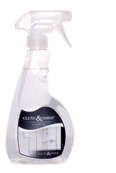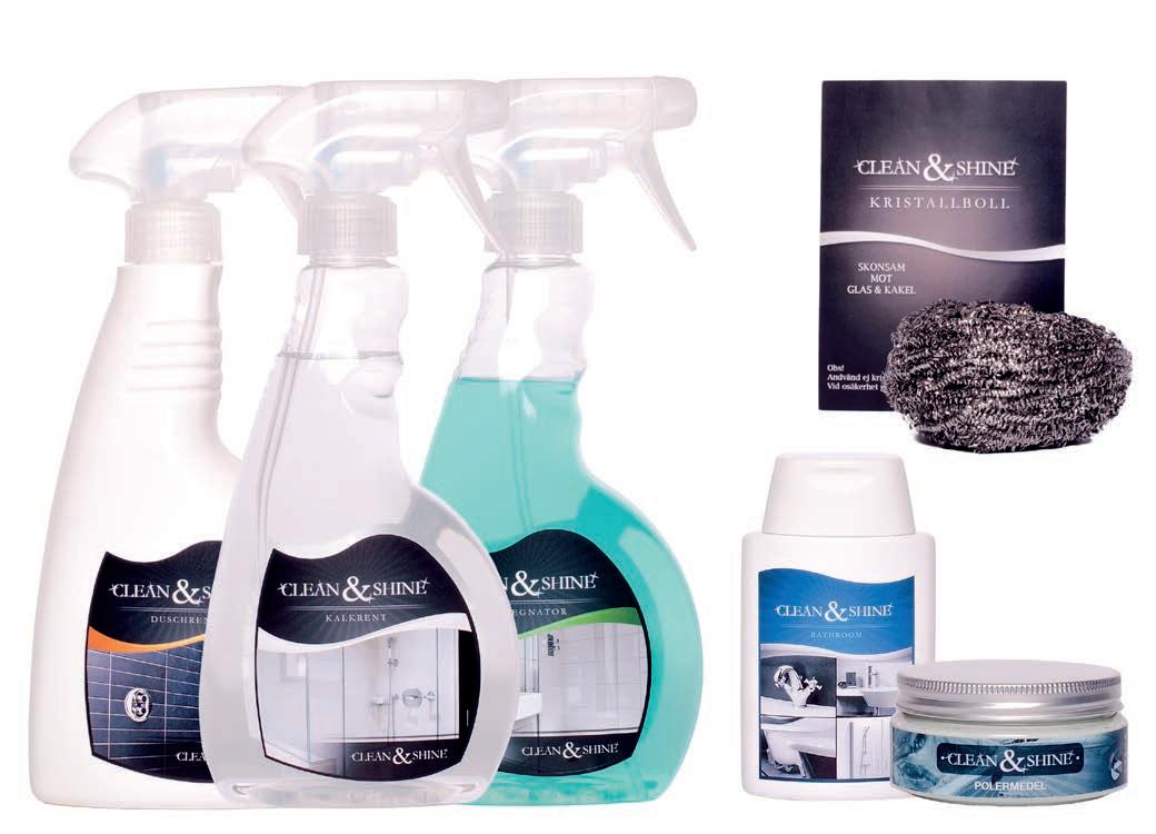 Använd med fördel något av våra rengöringsmedel Impregnator-, Duschrent- eller Kalkrent Clean & Shine. (Kristallboll endast vid hårda avlagringar). För information, se sid 159.