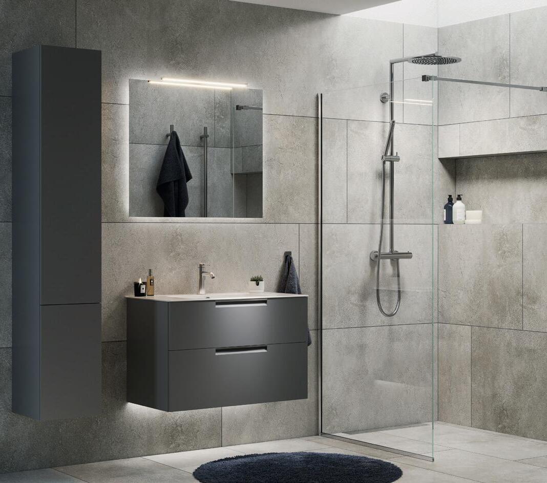 Empire dusj hvit 90x90, pris 11.995,- Asti takdusjbatteri i krom, pris 11.095,Møbelserie Crown Frame i antrasitt 800 mm med ovenpåliggende servant i porselen og benkeplate Keon, pris 18.695,- Speilskap 800 mm antrasitt med rampebelysning, pris 10.695,- Høyskap 400 mm i antrasitt med front Frame, pris 7.695,- MD5 håndtak pris 219,-/stk. Underskapsbelysning 800, pris 1.895,- Asti servantbatteri høy i krom, pris 4.595,- Art elektrisk håndkletørker i krom med timer, pris 3.995,-/stk.
