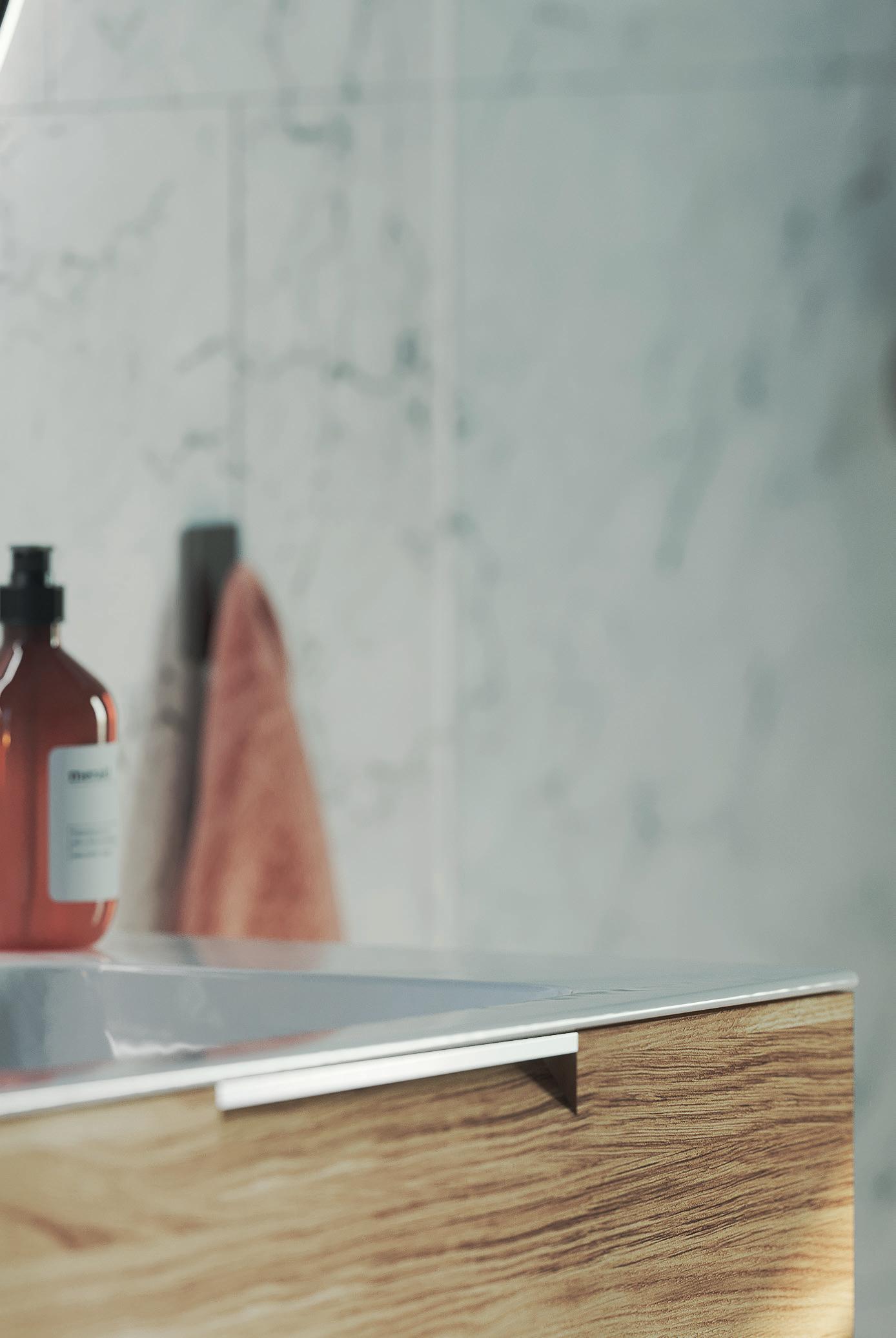 Glass og profiler er integrert i hverandre og skaper en vakker linje i baderommet. Profilene er helt slette uten synlige skruer.