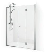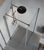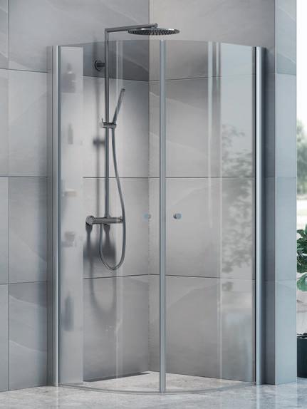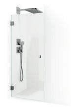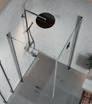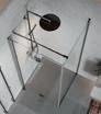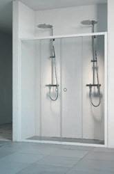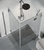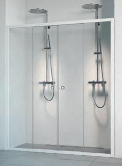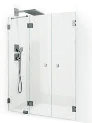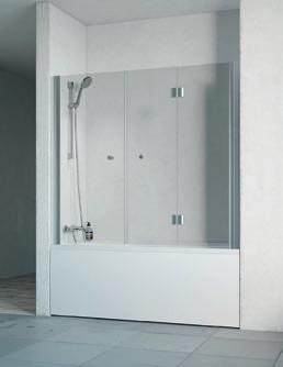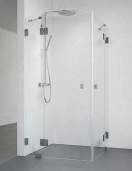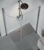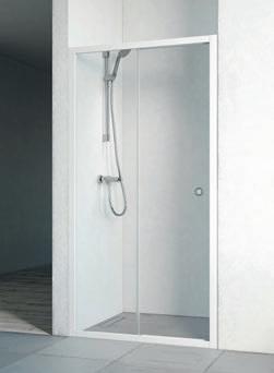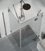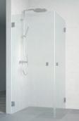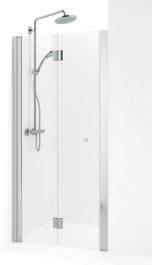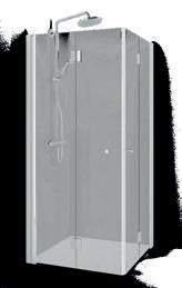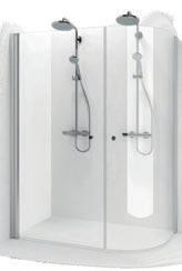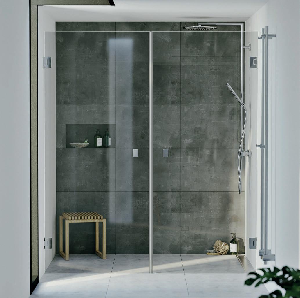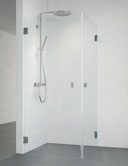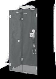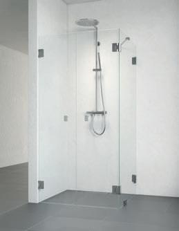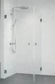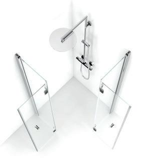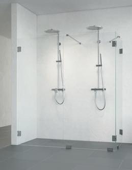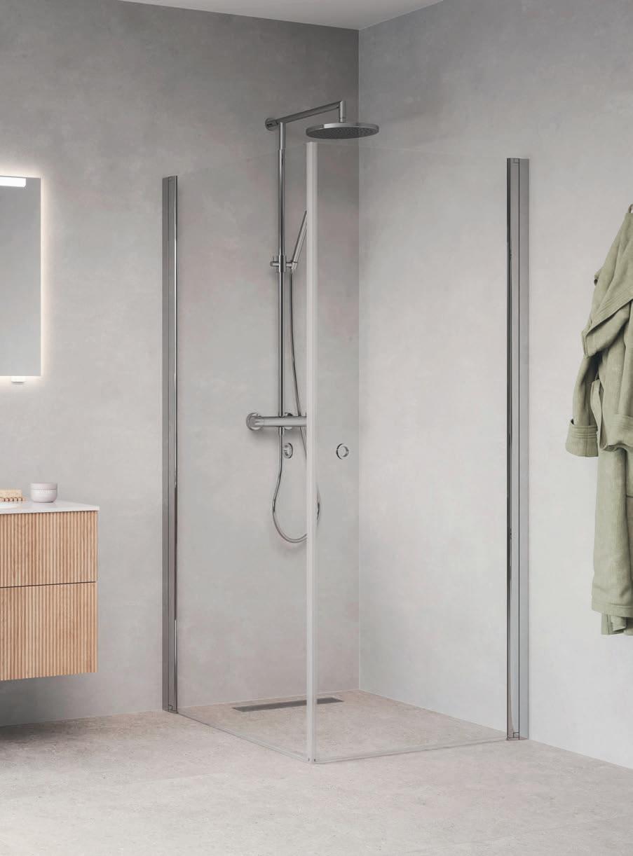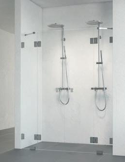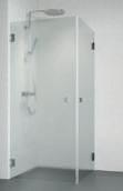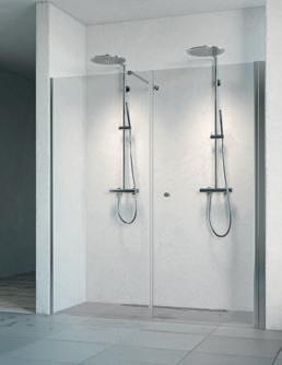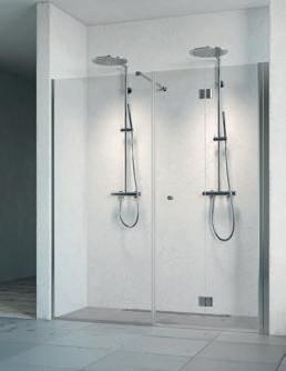 En dusjløsning med hengslede dører som kan skyves inn på midten og så legges inn til veggen. En perfekt løsning i bad der toalett eller vask er plassert kloss inn til dusjen.